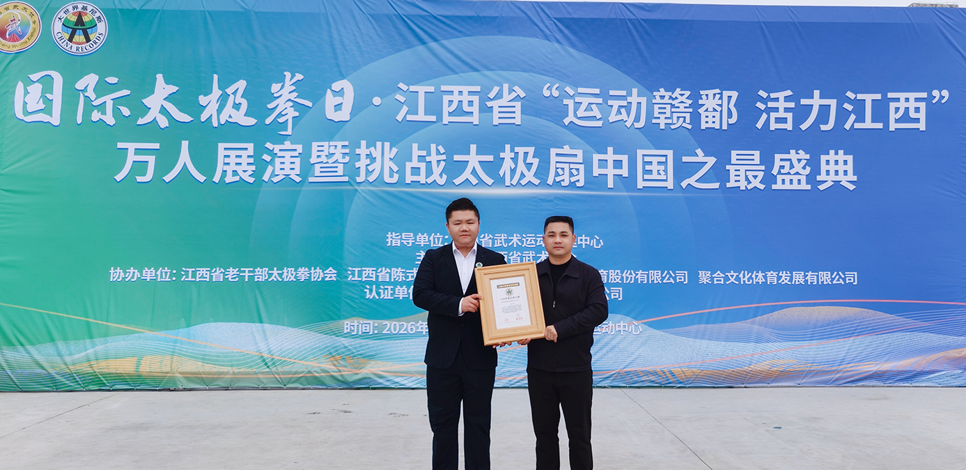 2026年3月21日由江西省武术运动管理中心指导,江西省武术协会主办,江西省老干部太极拳协会、江西省陈式太极拳协会、江西省中昌文化体育股份有限公司、湖北省聚合文化体育发展有限公司协办的“国际太极拳日·江西省‘运动赣鄱 活力江西’万人展演暨挑战太极扇中国之最盛典”活动在江西省南昌市中昌红网运动中心等地举行,现场共有8141名太极爱好者共同参与太极扇展演活动。