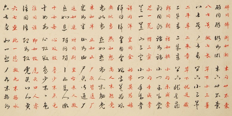 草书、行楷:各1408字 徐高虎、徐丽(北京)自2006年6月至2008年9月搜集古今名家草书作品,编成草书歌诀,并以草书、行楷对照的形式书于14张68×136厘米的宣纸上(另附偏旁部首各158个)分别装裱成镜片。 NO:02726